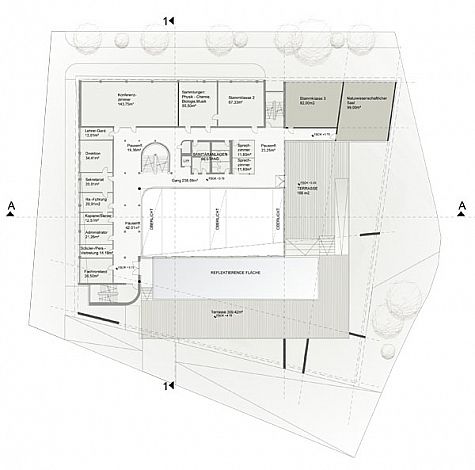 diese konzeptidee ermöglicht die weiterentwicklung des bestandes zu „einem“ neuen baukörper und die schaffung eines terrassenförmigen freiraums im 1. obergeschoss. dieser freiraum und die neuorganisation des einganges vernetzen das schulgebäude mit dem außenraum und bereichern die innen/außenbeziehung der schule wesentlich. die neue raumskulptur wird durch diese vielfältigen außen/innenraumsequenzen erlebbar.